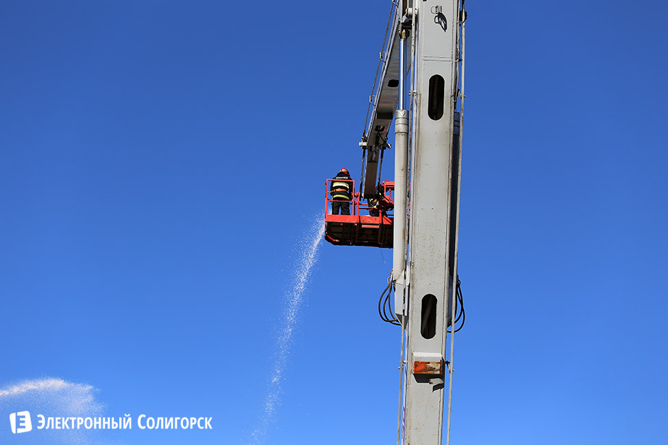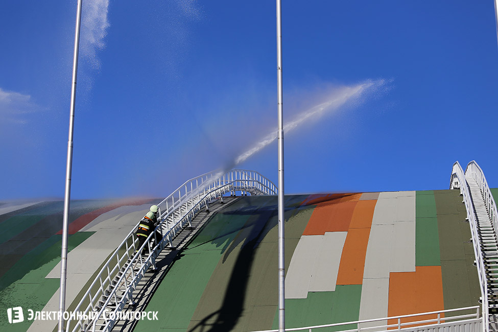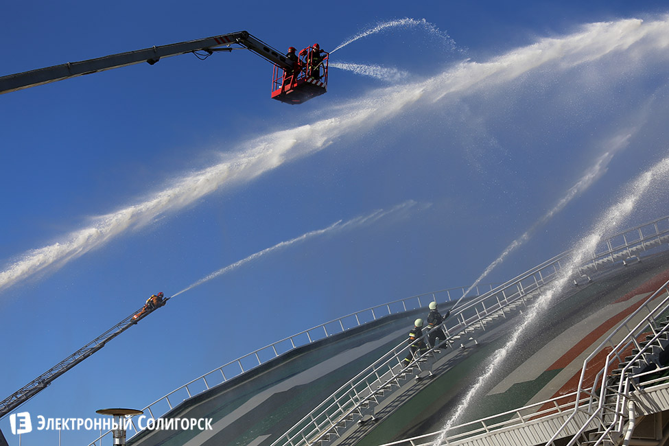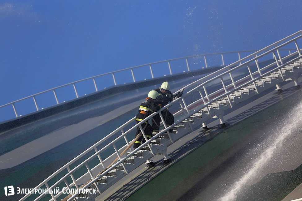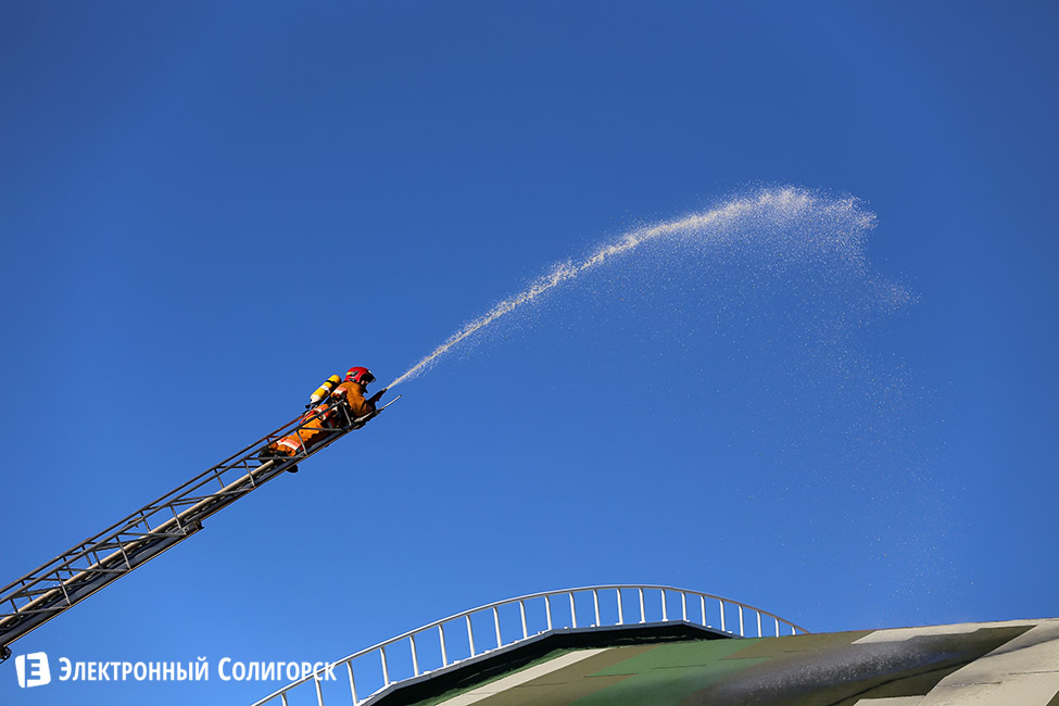 Отработали спасатели действия по удалению дыма из ледовой арены, была проведена работа по тушению огня в задымленном помещении. Последний этап – ликвидация загорания кровельного покрытия.