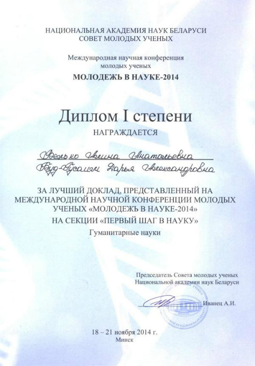 - Одна из работ наших учащихся была отмечена Дипломом I степени в секции "Гуманитарные науки" - это работа Алины ВЕЛЬКО и Дарьи БУД-ГУСАИМ, выполненная под руководством учителя белорусского языка и литературы Людмилы РУДЕНКО, - прокомментировала Елена ЕВИЧ.
