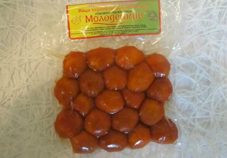Это для тех, кто не любит деликатесы и остаётся верен традиционному вкусу отварных яиц, но не любит их отваривать и чистить. Маринованные перепелиные яйца продаются в ведёрках весом 200 грамм.