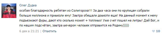 Первым неравнодушным человеком, встретившимся на пути дальнобойщика Олега оказался случчанин Олег Дудка, который не только лично помог попавшему в затруднительное положение тезке, обеспечив его топливом на выходные, накормив и, в лучших традициях душевных новогодних фильмов, сводив его в баню, но и разместил 6 декабря в одном из слуцких пабликов вконтакте такой вот пост: