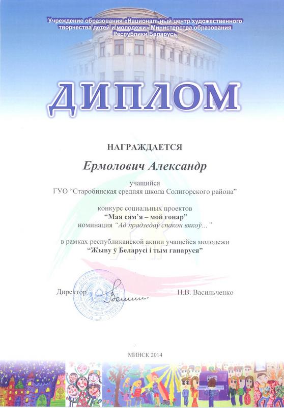 Учащийся ГУО «Старобинская средняя школа Солигорского района" Александр ЕРМОЛОВИЧ награждён Дипломом Национального центра художественного творчества детей и молодёжи Министерства РБ в номинации «Ад прадзедаў спакон вякоў…».
