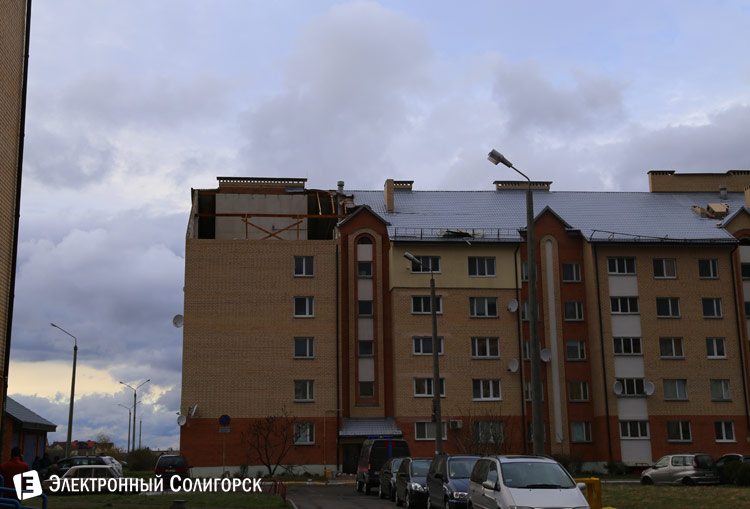Неподалеку от стадиона пошалил ураган и с жилым домом. Часть крыши на доме № 6 по ул.Октябрьской оказалась сорвана и просто сброшена на землю рядом с подъездами. По предварительным данным, пострадавших нет. Силами сотрудников Солигорского ГРОЧС ведется ликвидация последствий стихии.