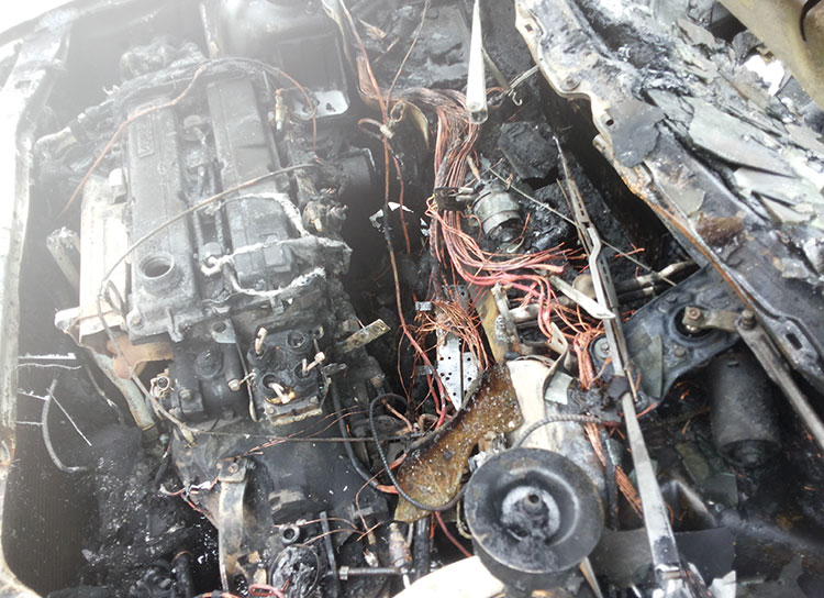 В результате пожара выгорел моторный отсек, поврежден капот, панель управления, закопчено лобовое стекло, салон автомобиля.