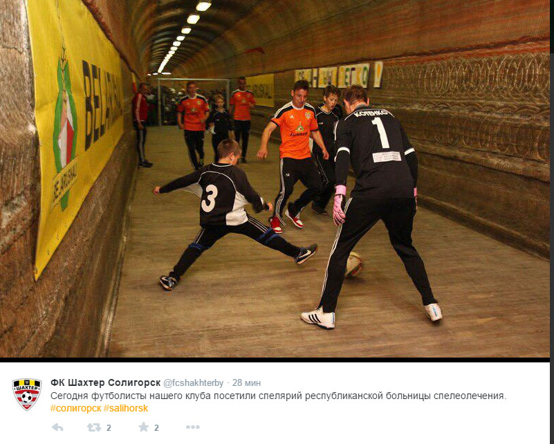 Сегодня футболисты солигорского "Шахтера" посетили спелярий Республиканской больницы спелеолечения. В рамках визита на глубине 416 м под землей футболисты сыграли матч с находящимися на оздоровлении детьми, сообщает официальный твиттер солигорского клуба.