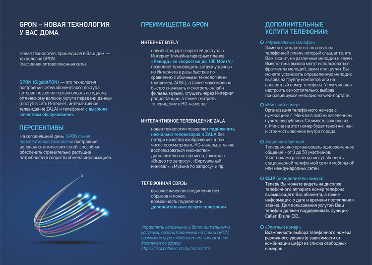Технология GPON (gigabit passive optical network) приходит на смену ADSL в дома белорусов. Основное отличие - оптическое волокно, которое доходит до самой квартиры и делает возможной передачу данных на скорости до 100 Мбит/с. С каждым годом абонентов GPON становится все больше.