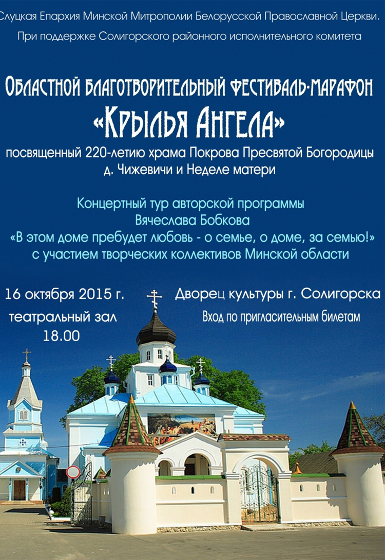 Фестиваль приурочен к Неделе матери и к 220-летию храма Покрова Пресвятой Богородицы в д.Чижевичи. В рамках события состоится концертный тур авторской программы Вячеслава Бобкова "В этом доме пребудет любовь - о семье, о доме, за семью!" с участием творческих коллективов Минской области.