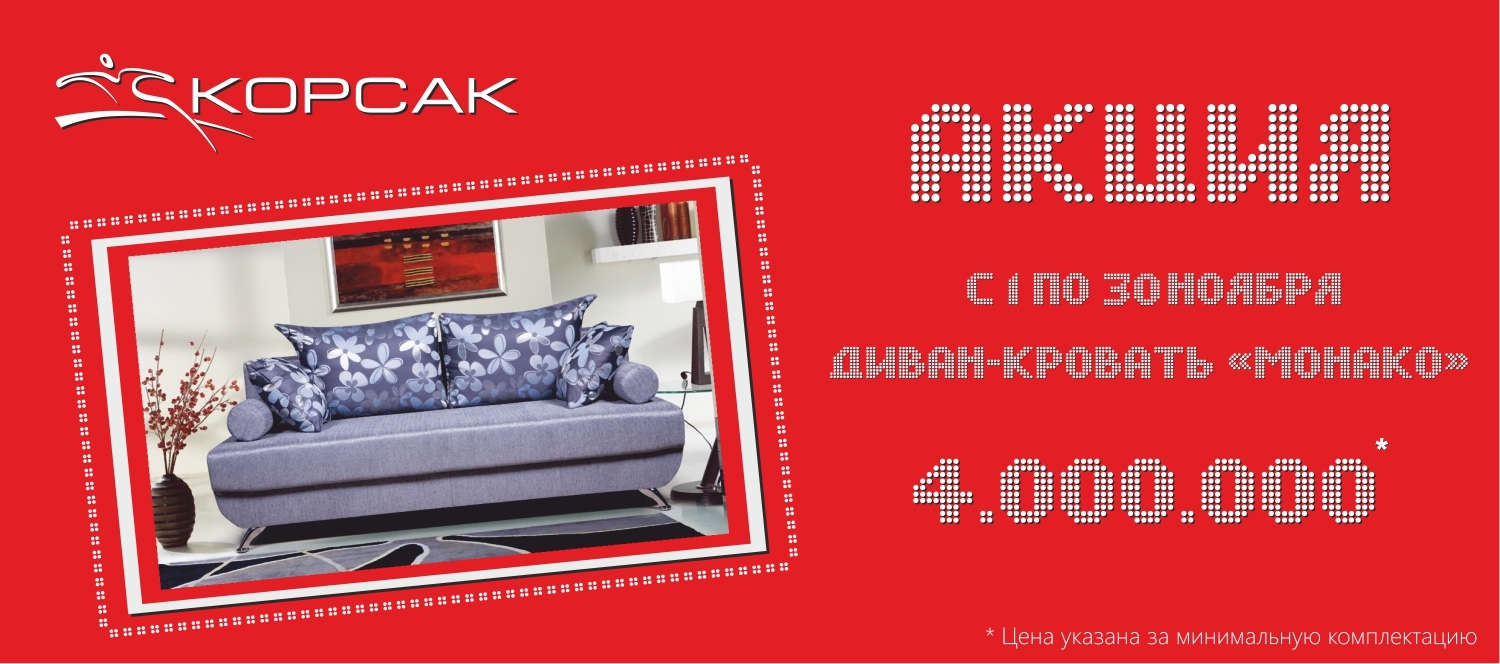 Внимание! С 1 по 30 ноября только в фирменных магазинах компании "КОРСАК" действует акция "Диван-кровать "Монако" всего за 4 000 000 руб." Спешите, Количество товара ограничено!