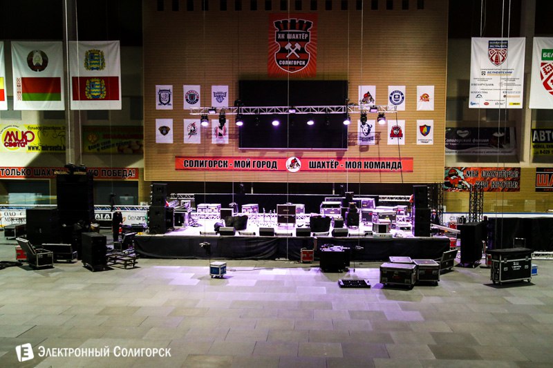 В самом СЗК вечером накануне концерта ледовая площадка постепенно превращалась в концертную. Вот как ведется подготовка помещения для выступления звездного гостя.