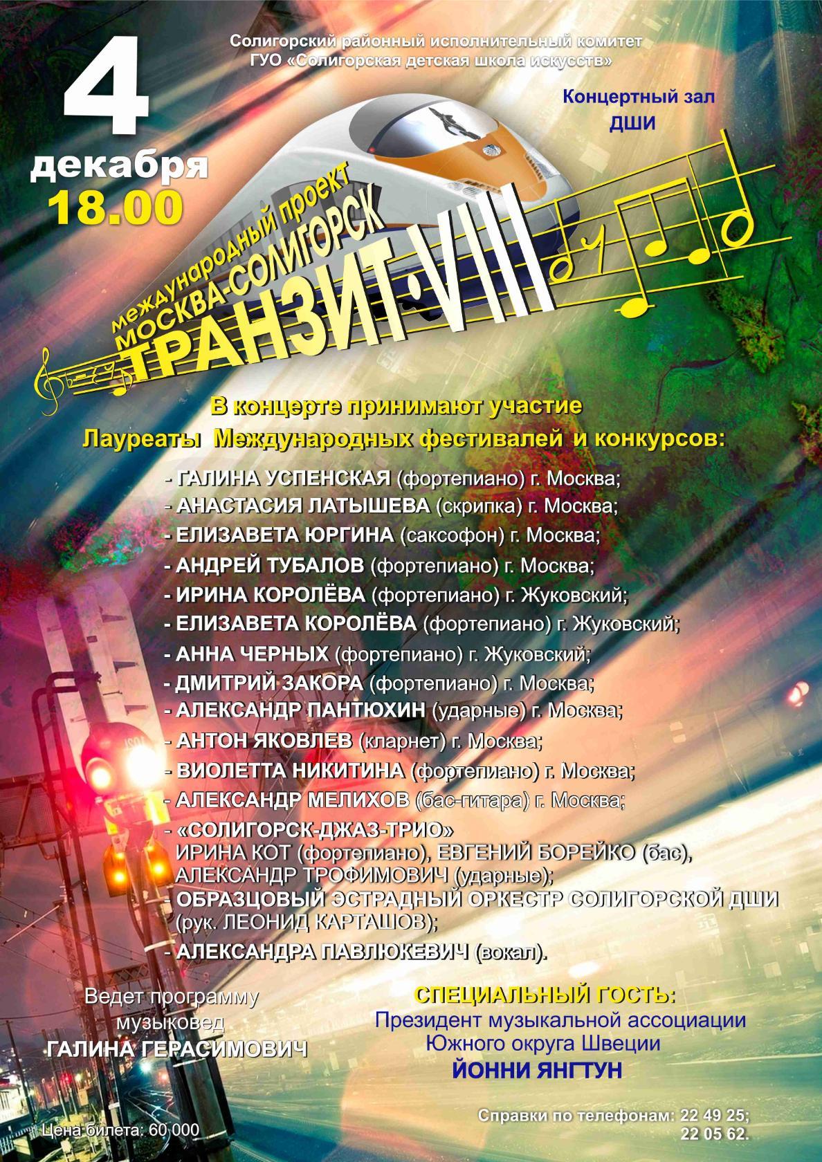 4 декабря в концертном зале Солигорской детской школы искусств состоится гала-концерт VIII международного творческого проекта "Москва – Солигорск ТРАНЗИТ".