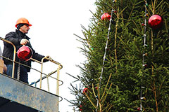 Золотые звезды, красные шарики. Главную солигорскую ёлку украшают новыми игрушками