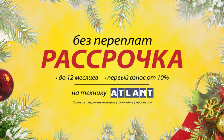 Покупать нужные и полезные вещи всегда приятно, покупать выгодно - приятно в двойне! Для того что бы сделать покупку холодильника, морозильника или стиральной машины максимально выгодной, АТЛАНТ приготовил очень выгодные условия рассрочки. Она позволит вам приобрести нужную технику, не нанеся ущерб семейному бюджету.