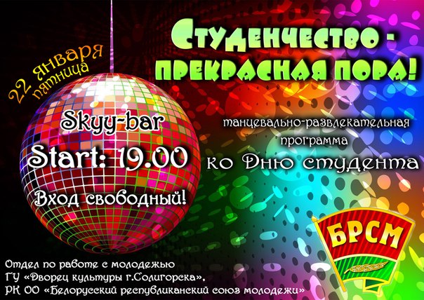 На танцевальную студенческую вечеринку приглашают молодых людей 22 января в Skyy-bar отдел по работе с молодежью Дворца культуры и РК ОО БРСМ.