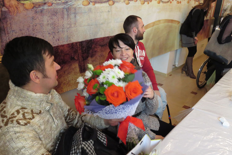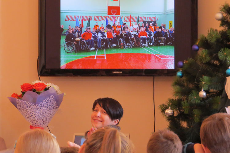 Во время презентации дети задавали вопросы о спорте, об увлечениях своих друзей-колясочников и с большим удовольствием поздравили подарками сделанными вместе с родителями своими руками. Макейчик Ирине были вручены прекрасные цветы от родителей и детей. С поздравлениями и вручением подарков выступило Православное молодежное братство.