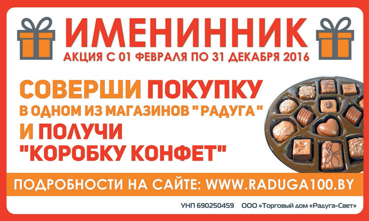 С 1 февраля по 31 декабря 2016* года в магазинах сети "Радуга" в Солигорске и Слуцке будет действовать акция "Именинник". Каждый, кто совершит покупку в одном из магазинов торговой сети в свой День рождения, получит в подарок коробку конфет. Подробнее об условиях акции читайте ниже.