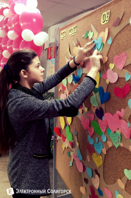 Уже с самого утра вокруг праздичного почтового ящика началось столпотворение. Кто-то опускал в почтовый ящик валентинки, кто-то подходил за заранее заготовленными сердцами для дерева пожеланий, кто-то брал номерки для поиска пары, а многие совмещали сразу несколько действий. Весь процесс контролировали ангелочки с крылышками (девочки 7-8-х классов).