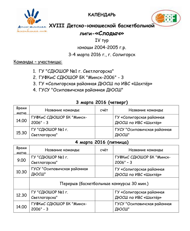В Солигорске 3-4 марта в Солигорске проходят игры ДЮБЛ-«Слодыч» среди команды группы "В" с участием юношей 2004-2005 гг.р.