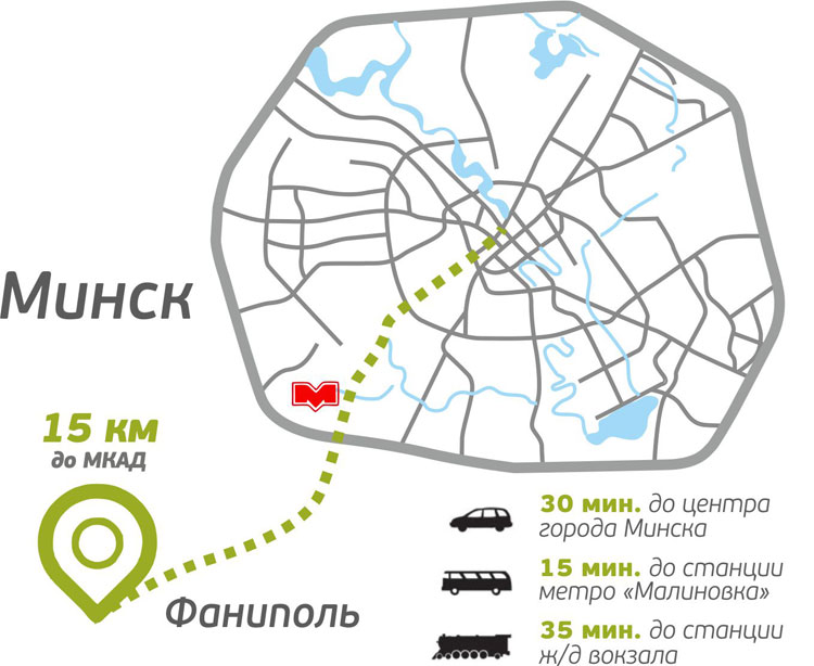 При этом Вы будете всего в 15 км от столицы. По Брестской трассе до ближайшей ст. метро «Малиновка» - 10 минут езды на машине. До Минска можно также добраться на рейсовом автобусе, маршрутках или электричках эконом- и бизнес-класса. Кстати, последние – самые скоростные: за 20 минут они доезжают на центральный железнодорожный вокзал столицы. К тому же, Минск в этом направлении интенсивно развивается, строится метро. И лет через 5 – 6, пожалуй, у Фаниполя есть перспектива стать его частью.