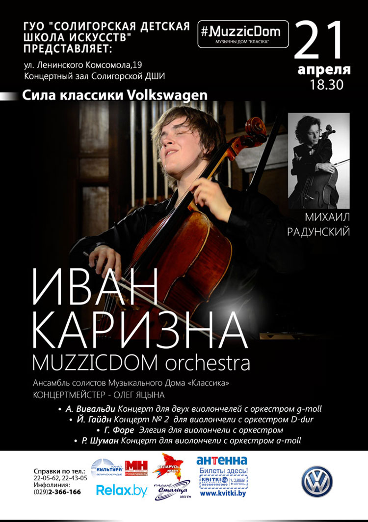 Виолончелист Иван Каризна, не успев отыграть концерт с прославленным симфоническим оркестром Мариинского театра в Мехико, спешит порадовать белорусского зрителя. 21 апреля И. Каризна выйдет на сцену Концертного зала Солигорской детской школы искусств в сопровождении ансамбля солистов оркестра Музыкального Дома «Классика» (концертмейстер – Олег Яцына) и, таким образом, при поддержке Volkswagen Belarus откроет в Солигорске серию концертов «Сила классики Volkswagen».