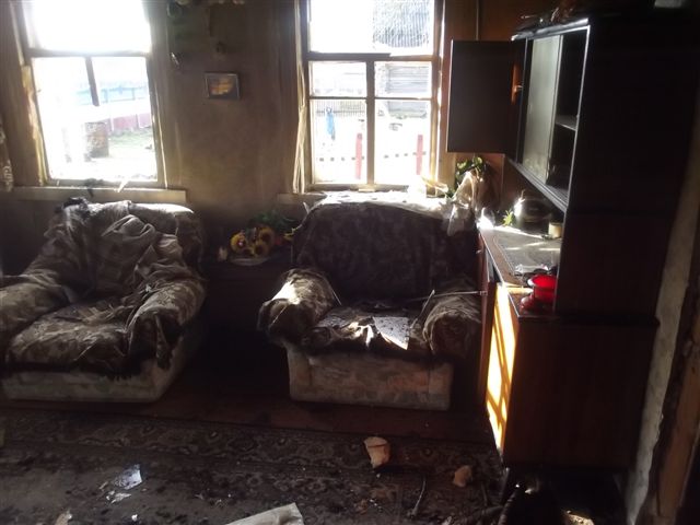 В результате пожара поврежден пол на площади 2м2 в комнате 3х5м, дверная деревянная коробка, дом закопчен.