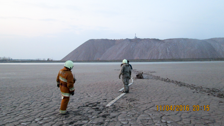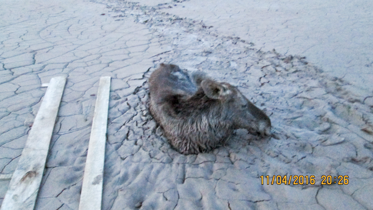 Прибывшие на место спасатели обнаружили полуторагодовалого лося, который находился в рассолосборнике в 70 метрах от края шламохранилища (площадь шламохранилища составляет около 15 Га, глубина 1,5 метра).