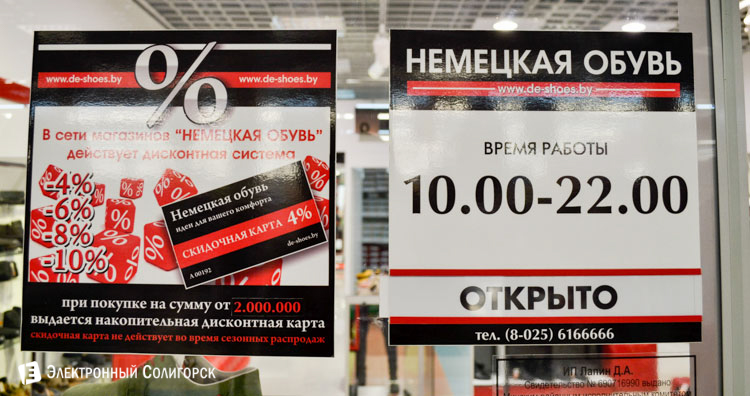 Магазины «Немецкая обувь» работают для вас в Солигорске по адресу: торговый центр «Корона» и гипермаркет «Грин».