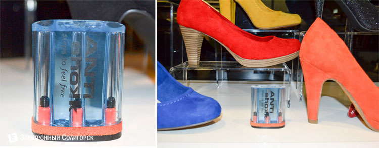 Технология ANTIshock используется при изготовлении каблуков и обеспечивает долговременную разгрузку всего позвоночника и суставов за счет смягчения шага на 50 %. Данная разработка изначально была придумана для профессиональной спортивной обуви. ANTIshock снижает нагрузку не только на позвоночник, но и уменьшает давление на стопу.