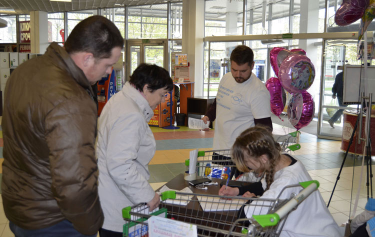 Волонтеры дежурят в магазинах, информируют покупателей об акции и предлагают поучаствовать в сборе необходимых товаров для нуждающихся, при этом раздают листовки с перечнем того, что может пригодиться нуждающимся солигорчанам.