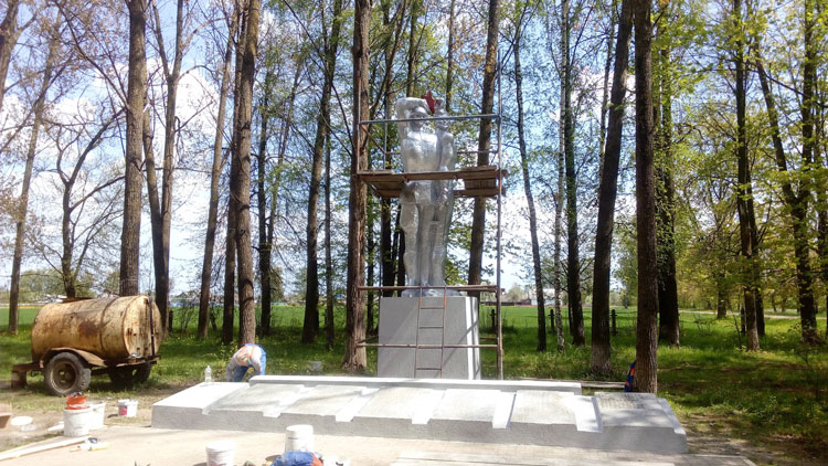 Больше работы было с памятником в д. Мозоли. Это скульптурное изображение двух воинов высотой около 6 метров, постамент которого требовал значительного обновления. Этим объектом занимались бригада штукатуров под началом Раисы Клезович и бригада маляров под руководством Аллы Михновец, которые многое сделали для декоративной отделки этого объекта. Хочу выразить особую благодарность художнику-оформителю ИВЦ стройтреста № 3 Андрею Моисеенко, который много труда вложил в надписи на металлических элементах памятника.
