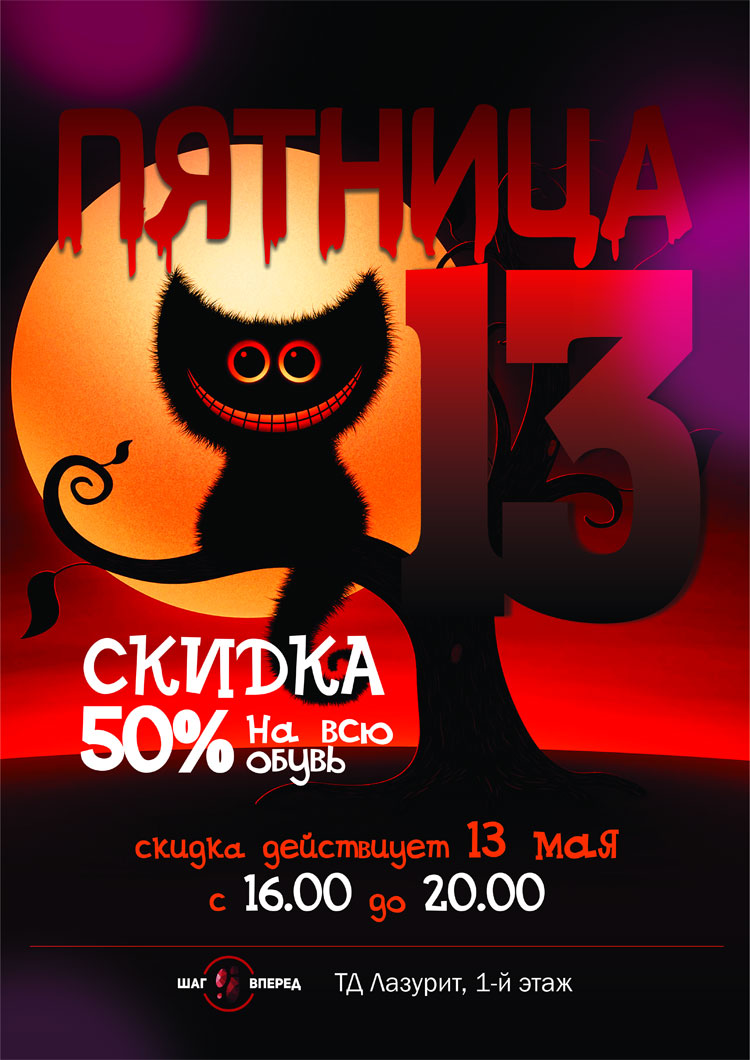 Все-таки в пятницу 13 по всем мистическим законам совершаются самые невероятные события. А как еще объяснить фееричные скидки в магазине обуви «Шаг вперед»? В пятницу здесь будет проходить распродажа с многообещающим названием «Black Friday». С 16:00 до 20:00 всех гостей магазина ожидает СКИДКА 50% НА ВСЮ ОБУВЬ. Ну, и чем не мистика?