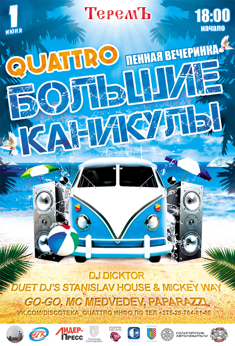 В среду, 1 июня, в 18.00 ресторан "ТеремЪ" в Солигорске приглашает всех на пенную вечеринку "Большие каникулы" в рамках проекта Quattro!