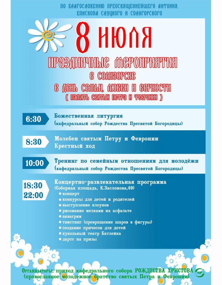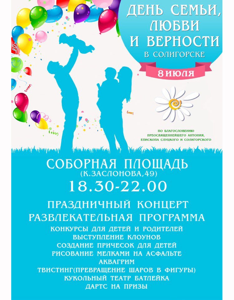 8 ИЮЛЯ в Солигорске продйут торжества, посвящённых ДНЮ СЕМЬИ, ЛЮБВИ И ВЕРНОСТИ, и памяти СВЯТЫХ ПЕТРА И ФЕВРОНИИ, покровителей брака. Все желающие солигорчане могут принять участие в праздничных мероприятиях.
