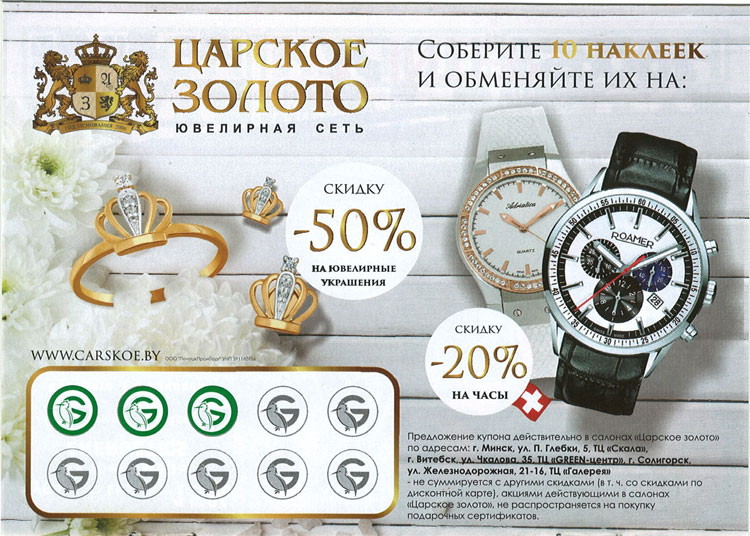 Как прекрасно баловать себя и своих близких роскошными подарками – ювелирными украшениями, которые останутся великолепным воспоминанием на долгие годы. Тем более что в салоне «Царское золото» до 31 октября действует акция: собери 10 наклеек Green и обменяй их на ювелирные изделия со скидкой - 50% и часы со скидкой - 20%.