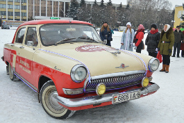 Зефирный экипаж. Дед Мороз приехал в Солигорск на "Волге" и раздавал сладости на площади