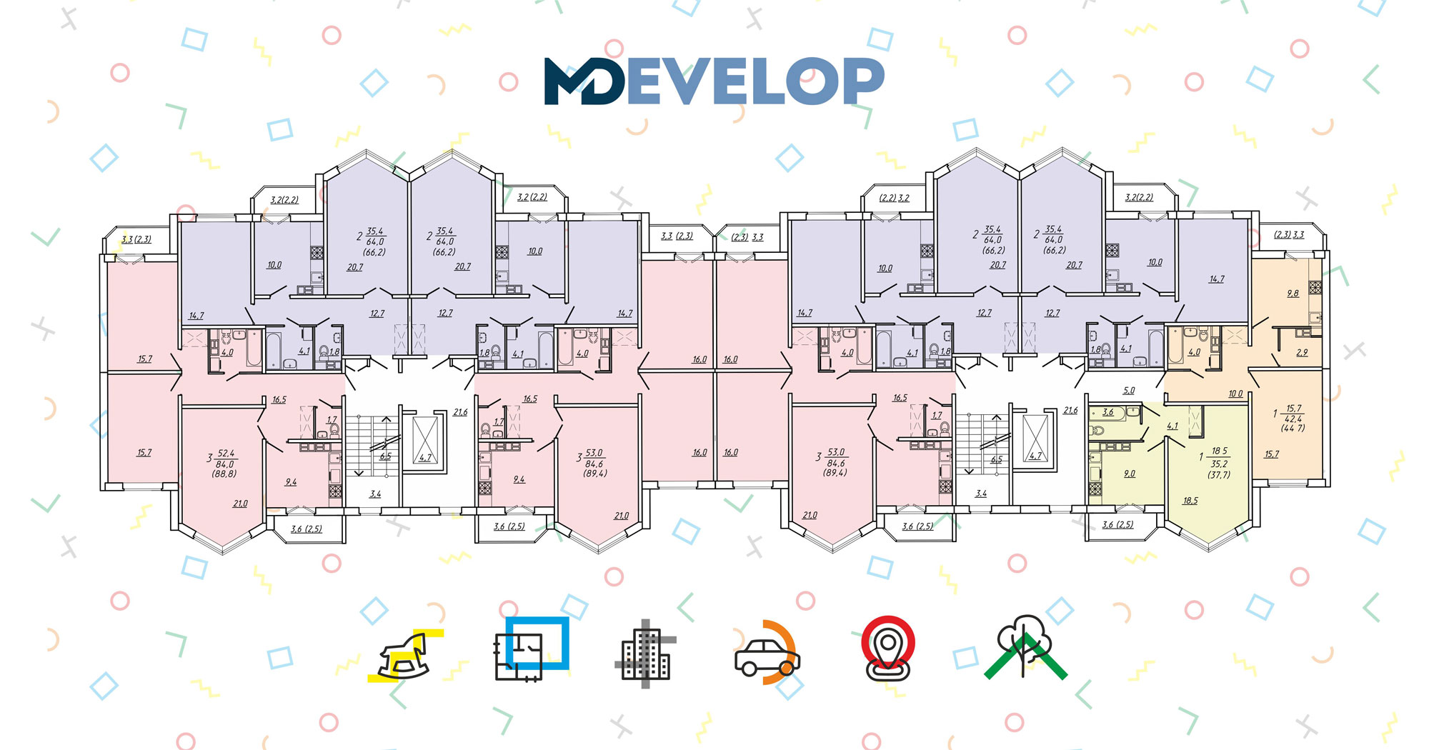 На каждом этаже расположено всего 4 – 5 квартир. Идеальное пространство для того, чтобы все соседи не создавали друг другу неудобств, были дружны и приветливы.
