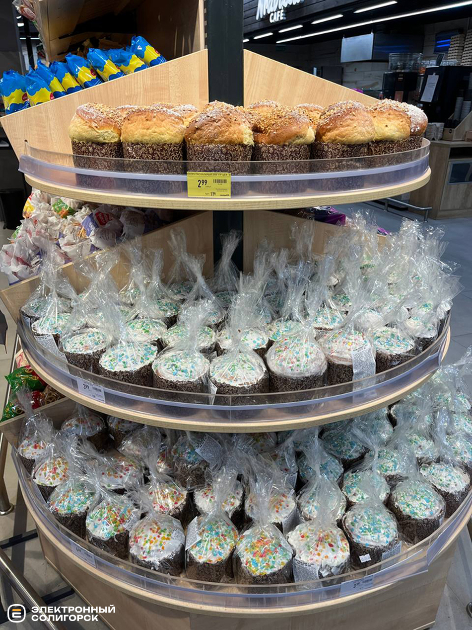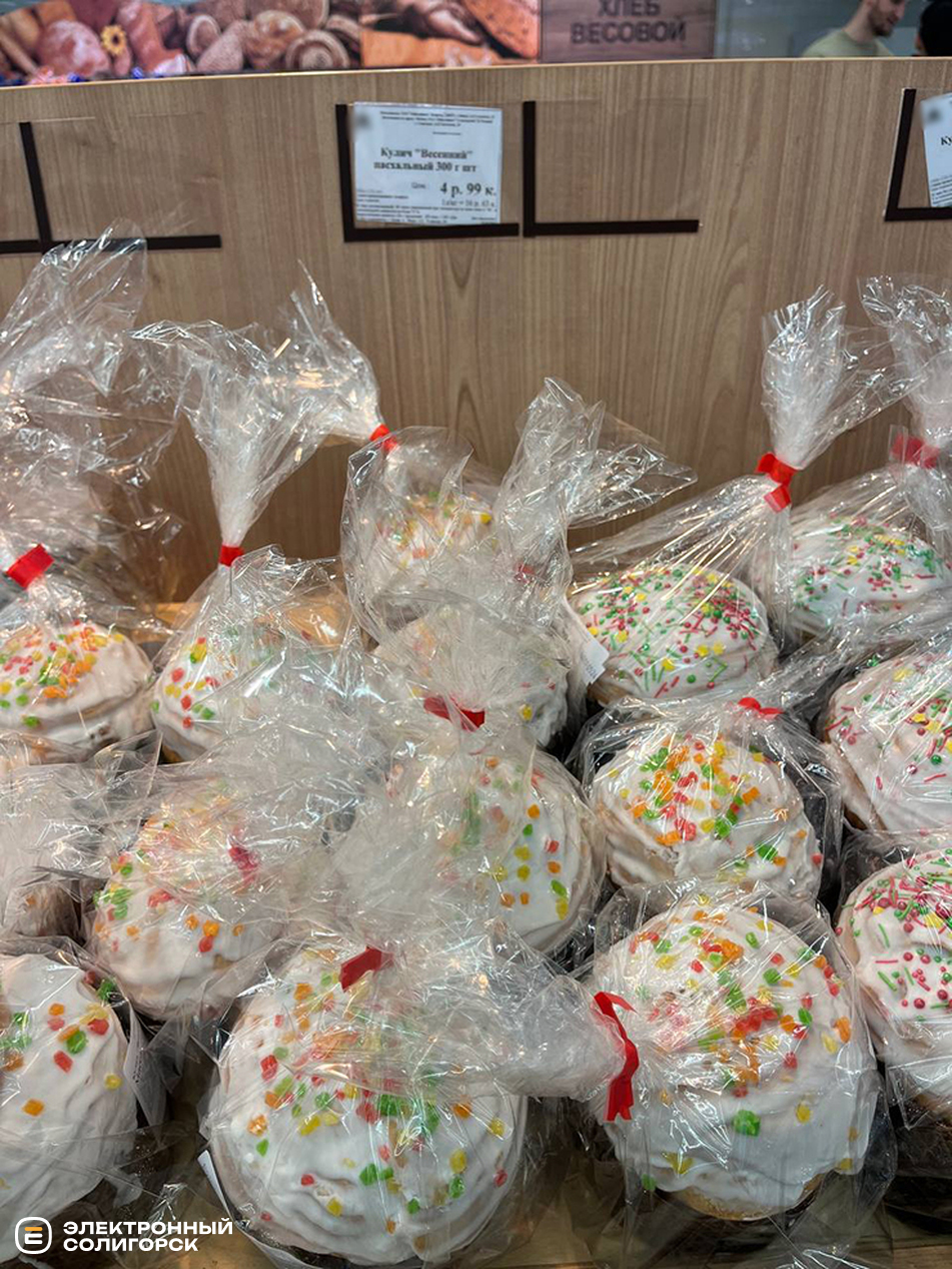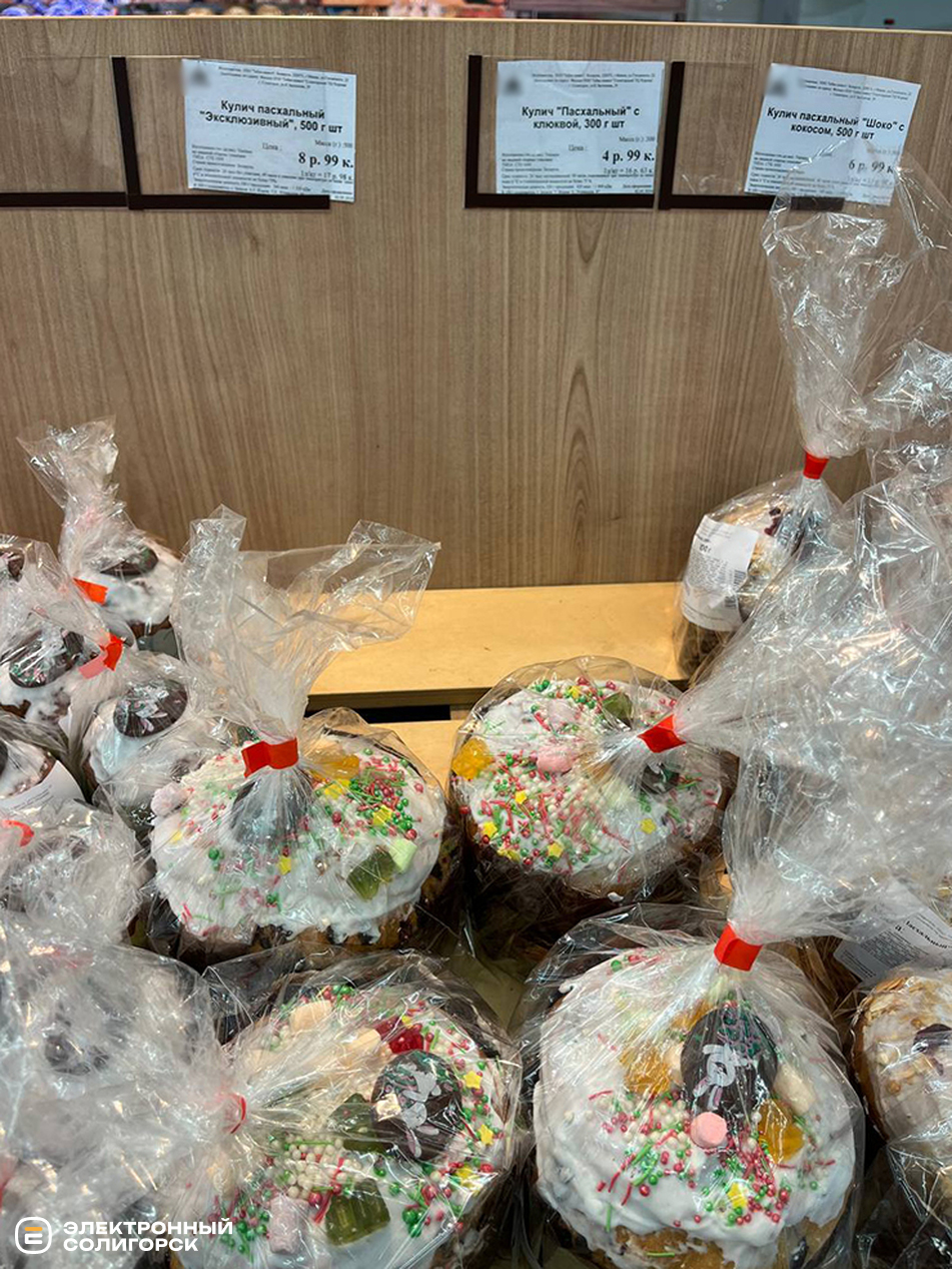 Ассортимент большой - праздничную продукцию разбирают быстро, продавцы торопятся подкладывать товар. Вес куличей - от 200 до 700 г, в зависимости от размера меняется и цена.