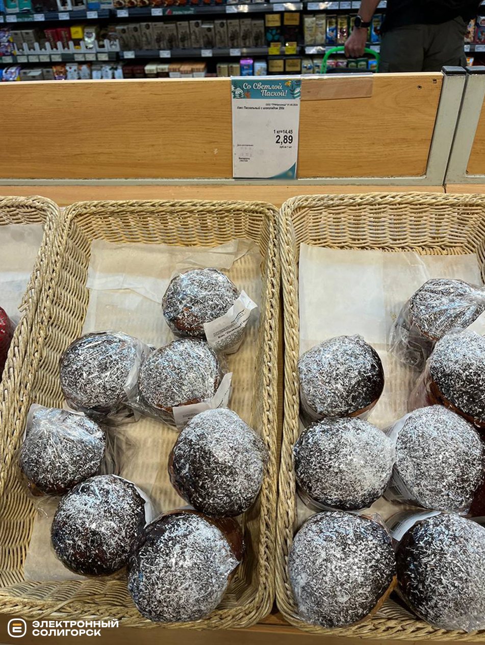 В одном из солигорских магазинов кулич "Весенний" весом 340 г стоит 4,99 руб., кулич с кленовым сиропом (380 г) - 6,99 руб., а кулич "Пасхальный" с изюмом весом 500 г стоит 5,99 руб. "Краффин с шоколадом" (350 г) увидели за 7,29 руб. и просто "Краффин" (320 г) тоже за 7,29 руб. Все они произведены в Минской области.