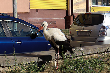 Обычно в конце августа аисты, собравшись в стаи, покидают Беларусь и отправляются на юг. Однако на днях одинокая белая птица с чёрными крыльями была замечена в Солигорске на детской площадке за военкоматом. Символ страны не спеша прогуливался по газону, не обращая внимания на прохожих. Почему же он не улетел на зимовку?