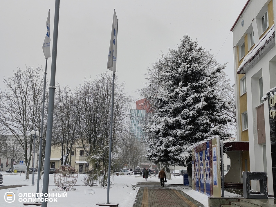 В Солигорск после нескольких теплых дней резко похолодало и выпал снег. Город преобразился: дети с восторгом играют в снежки, а коммунальные службы экстренно занимаются расчисткой дорог и тротуаров.